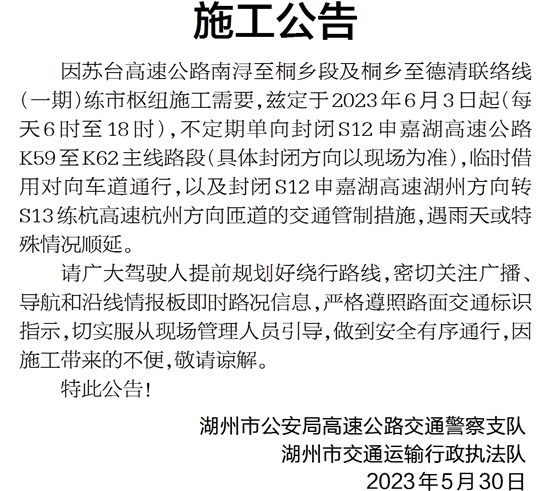 因苏台高速公路南浔至桐乡段及桐乡至德清联络线 (一期)练市枢纽施工需要,兹定于2023年6月3日起(每天6时至18时),不定期单向封闭S12申嘉湖高速公路K59至K62主线路段(具体封闭方向以现场为准),临时借用对向车道通行,以及封闭S12申嘉湖高速湖州方向转S13练杭高速杭州方向匝道的交通管制措施,遇雨天或特殊情况顺延。