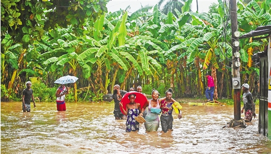 6月3日,在海地小戈阿沃,人们在积水的道路上行走。海地近日遭遇强降雨,引发洪涝灾害。