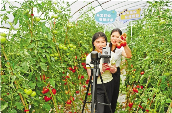 当前,乐清各地农民抢抓农时,开展各类农作物种植、管护、采摘等。图为6月4日,在当地长山村,农创客在西红柿种植大棚进行直播带货。