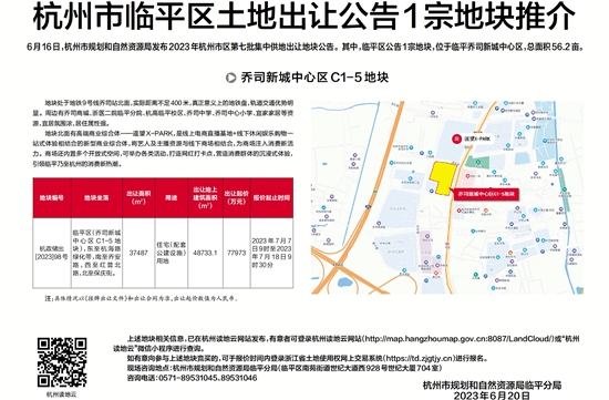 6月16日,杭州市规划和自然资源局发布2023年杭州市区第七批集中供地出让地块公告。其中,临平区公告1宗地块,位于临平乔司新城中心区,总面积56.2亩。