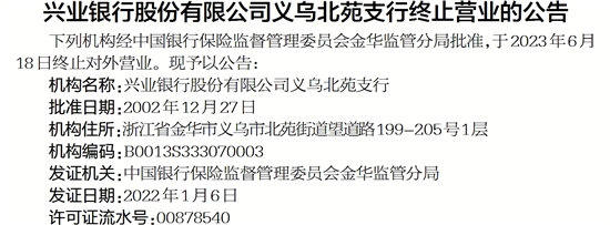 兴业银行股份有限公司义乌北苑支行终止营业的公告
