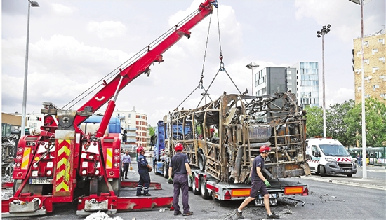 6月30日,在法国巴黎以北的欧贝维利耶一处公交总站,工作人员将被示威者焚毁的公交车拖走。