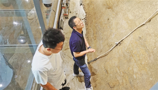 孙海波(右)在老虎岭水坝遗址前检查监测设备安装情况。 受访人供图
