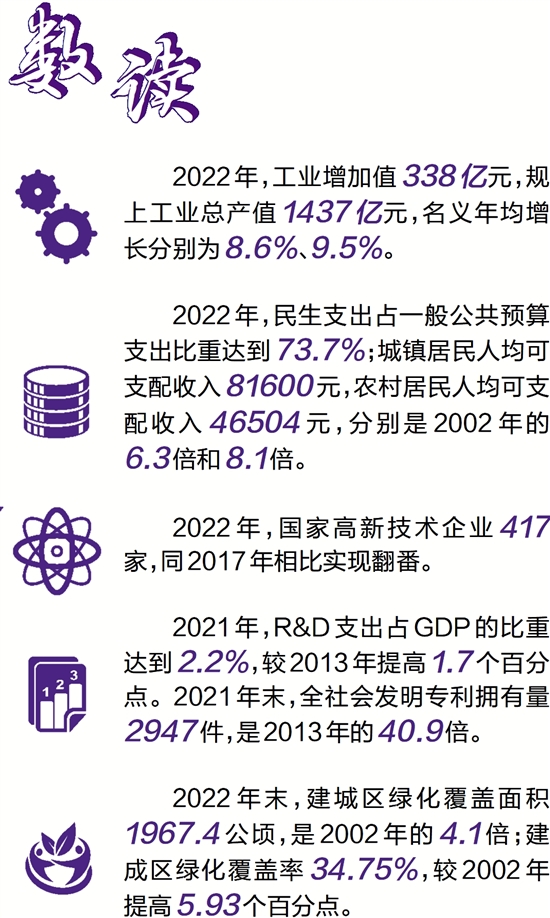 2022年,民生支出占一般公共预算支出比重达到73.7%;城镇居民人均可支配收入81600元,农村居民人均可支配收入46504元,分别是2002年的6.3倍和8.1倍。