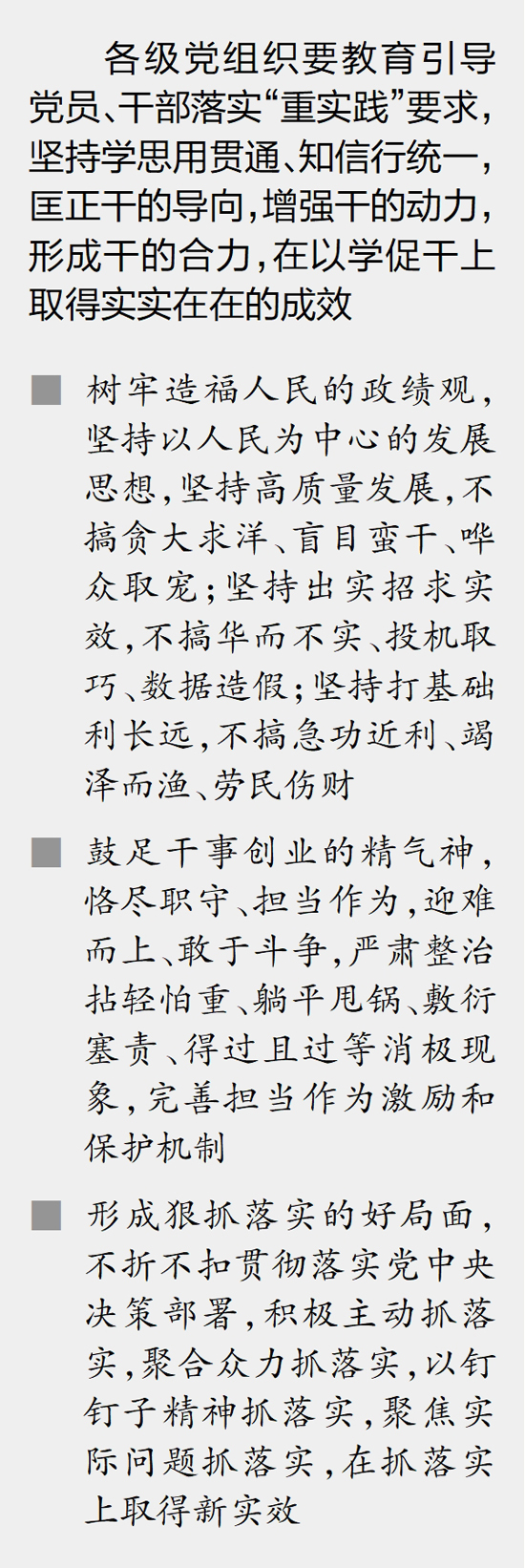 各级党组织要教育引导党员、干部落实“重实践”要求,坚持学思用贯通、知信行统一,匡正干的导向,增强干的动力,形成干的合力,在以学促干上取得实实在在的成效