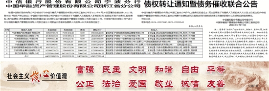 根据中信银行股份有限公司宁波分行与中国华融资产管理股份有限公司浙江省分公司于2023年6月26日签署的信银法保(2023)批转0010号《资产转让协议》,中信银行股份有限公司宁波分行已将其对下列借款人及其担保人享有的权利(包括但不限于主债权、担保债权、违约金债权、损失赔偿权等相关附属权益)依法转让给中国华融资产管理股份有限公司浙江省分公司。中信银行股份有限公司宁波分行与中国华融资产管理股份有限公司浙江省分公司联合公告通知各借款人及担保人以及其他相关各方。