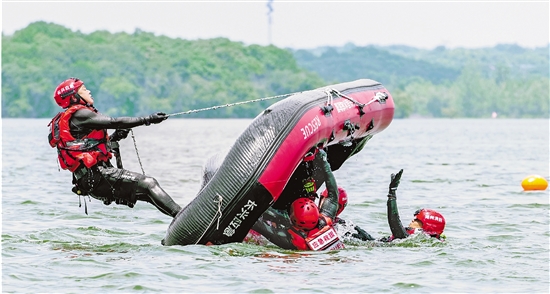 7月14日,长兴县在泗安镇仙山湖景区水域进行防汛演练,来自各乡镇(街道、园区)的综合应急救援队和县森林消防综合应急救援一大队共计17支队伍参加。图为队员正进行翻舟自救演练。 拍友 谭云俸 李金俊 摄