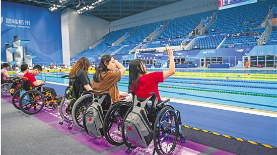 ◀ 杭州奥体中心游泳馆泳池边设置了无障碍观赛区,方便残疾人运动员自由观赛。
