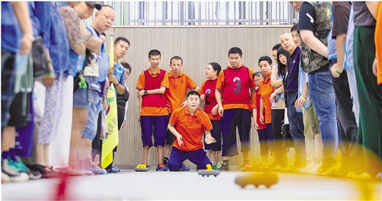 ▲ 7月14日,湖州市吴兴区环渚街道井安小学体育馆内,特奥运动员正在参与旱地冰壶比赛,喜迎杭州亚残运会倒计时100天。