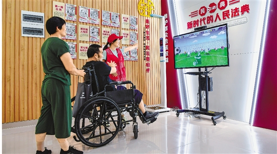 ◀ 金华开发区湖海塘社区新时代文明实践站内,工作人员正在帮助腿脚不便的邵大爷在模拟器上进行肢体康复训练。