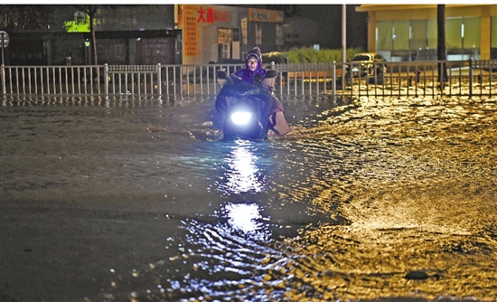 7月17日晚,在广东湛江海滨大道北,市民骑着电动车在积水中行进。
