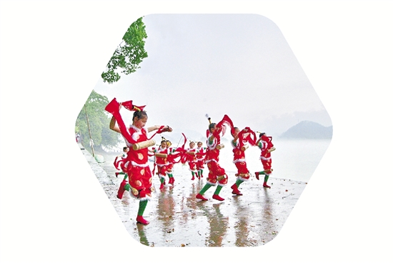 大港头镇儿童在古堰画乡景区演绎传统竹鼓舞