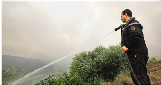7月24日,阿尔及利亚北部野火造成的死亡人数上升至34人。图为民防人员在灭火。