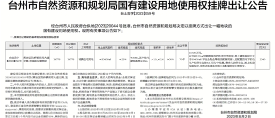 经台州市人民政府台供地[2023]20044号批准,台州市自然资源和规划局决定以挂牌方式出让一幅地块的国有建设用地使用权。现将有关事项公告如下: