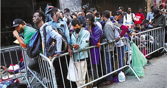 | 多家外媒1日报道,纽约罗斯福酒店外,数十名来自马里、塞内加尔等国的寻求避难者已经在大街上栖身近一周。根据纽约市法律,市政府必须为提出申请的无家可归者提供住所。纽约市长埃里克·亚当斯已经多次重申,纽约收容场所已经“人满为患”,无力接纳更多寻求避难者。纽约市政府说,去年春季至今,超过9.3万名寻求避难者抵达纽约。 新华社发 |