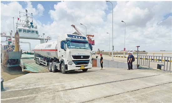 8月2日,载着两车共40吨液化天然气的滚装船“欣润海2”号抵达岱山。 拍友 席萌 摄