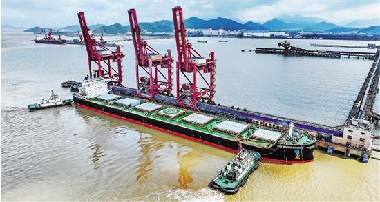 8月5日上午,载运着近70万吨货物的马绍尔群岛籍瑞丝德堡轮靠泊宁波舟山港岑港港区老塘山三期码头。随着台风“卡努”逐渐远离,舟山出入境边防检查站下辖沈家门、老塘山、金塘等执勤点迎来船舶出入境高峰,在港停泊避风的60余艘船舶1000余名船员申报办理出入境手续。