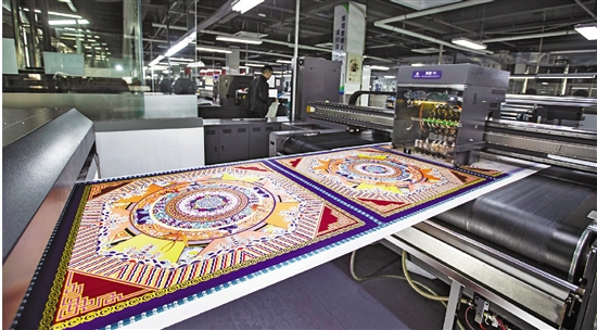 在万事利双面印花车间,人工智能数码印花技术让染料均匀牢固地“贴”到丝绸上。