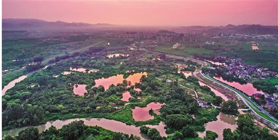近日,杭州余杭北湖草荡综合保护工程一期湿地生态修复项目全面完工。截至目前,北湖草荡记录有298种鸟类,包括白鹤、白头鹤、黑脸琵鹭等珍稀物种。图为8月14日,俯瞰晨曦中的北湖草荡。 本报记者 董旭明 摄