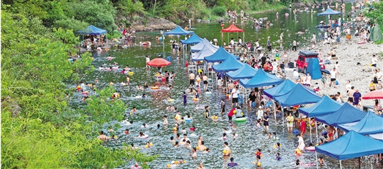 8月13日,在丽水市莲都区黄村乡严溪之畔的露营基地,来自各地的游客在溪水边消暑。近年来,莲都区黄村乡积极发展夏日水经济,村集体和村民收入明显提升。 拍友 胡肖飞 摄