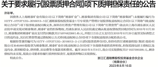 因债务人上海刚泰矿业有限公司(以下简称“刚泰矿业”)、刚泰集团有限公司(以下简称“刚泰集团”)未能履行编号为HZTY-HTGT1ZG-2016013-1《汇通刚泰股权投资基金1号专项资产管理计划股票收益权转让合同》(以下简称“《收益权转让合同》”)项下股票收益权回购义务,深圳市红塔资产管理有限公司(以下简称“红塔资管”)依法向上海市浦东新区人民法院申请实现对刚泰集团、刚泰矿业的担保物权,经浦东新区人民法院裁定确认收益权债权的回收时间为2018年8月28日,刚泰集团和刚泰矿业应支付的回购款共计5974423061.45元,并按日万分之五支付自2018年8月29日起至实际清偿之日的违约金,其后红塔资管通过债权转让方式将《收益权转让合同》项下全部权益现状分配给我公司。