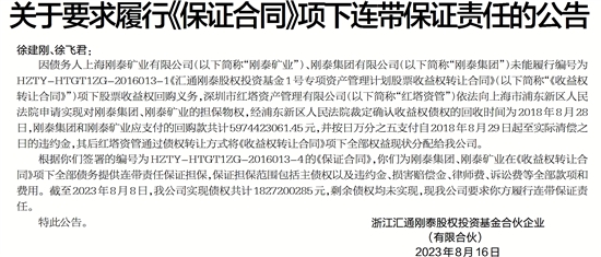 根据你们签署的编号为HZTY-HTGT1ZG-2016013-4的《保证合同》,你们为刚泰集团、刚泰矿业在《收益权转让合同》项下全部债务提供连带责任保证担保,保证担保范围包括主债权以及违约金、损害赔偿金、律师费、诉讼费等全部款项和费用。截至2023年8月8日,我公司实现债权共计1827200285元,剩余债权均未实现,现我公司要求你方履行连带保证责任。