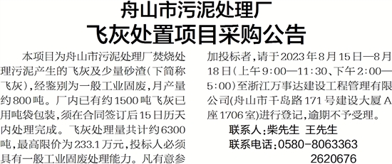 本项目为舟山市污泥处理厂焚烧处理污泥产生的飞灰及少量砂渣(下简称飞灰),经鉴别为一般工业固废,月产量约800吨。厂内已有约1500吨飞灰已用吨袋包装,须在合同签订后15日历天内处理完成。飞灰处理量共计约6300吨,最高限价为233.1万元,投标人必须具有一般工业固废处理能力。凡有意参加投标者,请于2023年8月15日—8月18日(上午9∶00—11∶30、下午2∶00—5∶00)至浙江万事达建设工程管理有限公司(舟山市千岛路171号建设大厦A座1706室)进行登记,逾期不予受理。