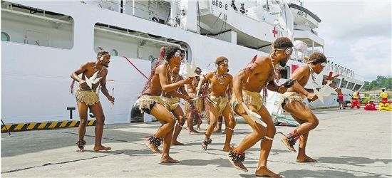 8月19日,中国海军“和平方舟”号医院船抵达所罗门群岛霍尼亚拉港,身着传统服饰的当地民众跳起舞蹈迎接。这是“和平方舟”号医院船首次访问所罗门群岛,也是中国海军舰船首次访问该国。 新华社发