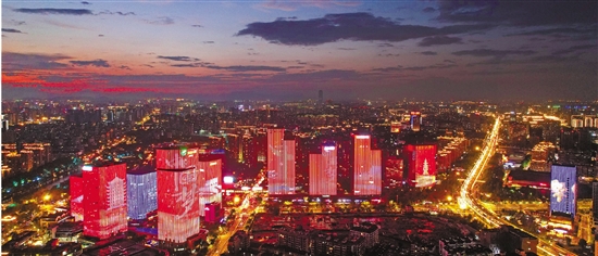8月19日晚,杭州运河CBD上演亚运主题灯光秀。拱墅区运河商务区块的11幢大型建筑、61351套灯具与周边上塘高架沿线、运河沿线夜景交相辉映,通过28个立面场景的实时切换,绘制出一幅以“人文亚运、智慧杭州、水韵拱墅”为主题的画卷。市民和游客可以在法定节假日以及每周的周二、周五、周六三天欣赏亚运主题灯光秀。 本报记者 董旭明 摄 |