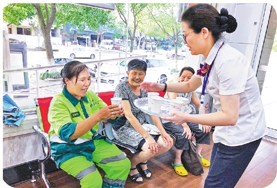 工行桐乡营业部大堂经理为在网点避暑的环卫工人递上一杯解渴的水,奉上属于工行人的关爱。