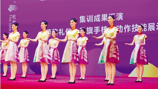 | 8月21日,杭州亚(残)运会颁奖礼仪、升旗手集中专项培训结营仪式在浙江交通职业技术学院举行。743名颁奖礼仪、升旗手,展示了基础仪态、技术细节、流线流程、赛事应急等方面集训的成果。图为颁奖礼仪代表进行核心动作技能展示。 本报记者 魏志阳 拍友 桑珊 摄 |