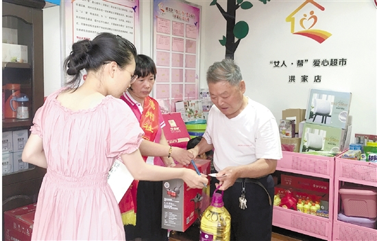 洪家街道辖区群众凭爱心超市卡到爱心超市领取所需物资