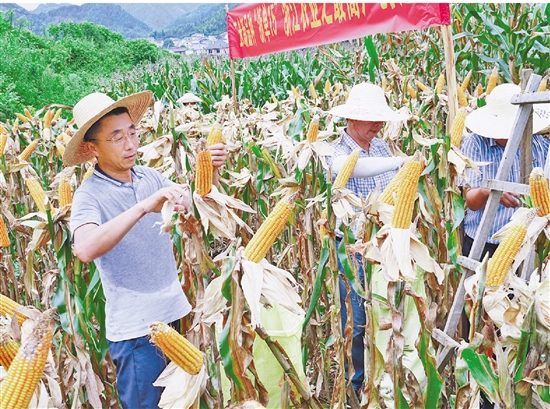 | 近日,浙江农业之最委员会办公室组织专家对开化县土根家庭农场的“浙单15”新品种玉米进行测产验收。“浙单15”是由省农科院玉米与特色旱粮研究所选育的普通玉米单交种,植株高、丰产性较好、品质较优。 朱恬静 摄 |