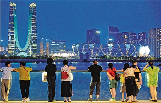 8月24日晚,杭州奥体中心亚运场馆群与周边建筑灯光交相辉映,夜景迷人,吸引众多市民游客在城市阳台隔岸观赏。 本报记者 林云龙 摄