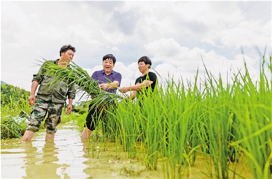 在仙居县广度乡西角村,浙江大学科技特派员吴良欢教授(中)在省级水稻科研试验田里指导农户种植。在吴良欢的指导下,当地试验田的地力大大提升,水稻的品质和产量得到有效提高。