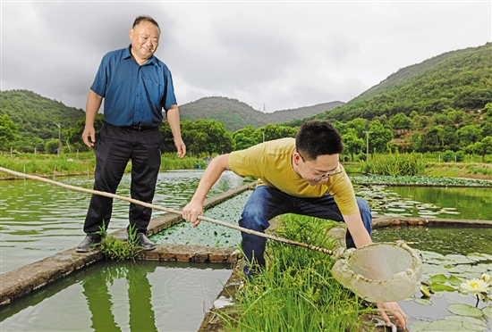 | 在舟山市白泉镇小展村的一处水产养殖基地内,浙江海洋大学科技特派员储张杰(左)正和基地负责人一同查看鱼苗生长情况。储张杰教授在安徽潜山的大别山深处找到光唇鱼鱼苗,在我省多个山区县建立繁育基地,为农村产业发展、农民增收作出重要贡献。 |