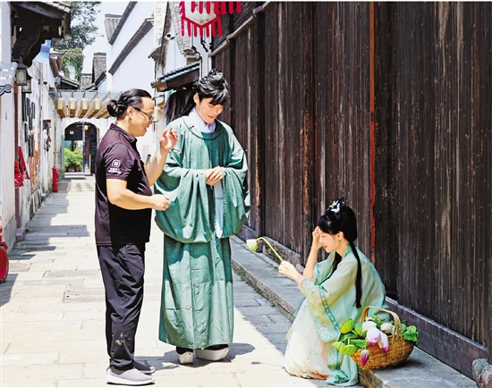 ▲ 记者(右)在活动预热短视频中扮演卖花女。 本报记者 于山 摄