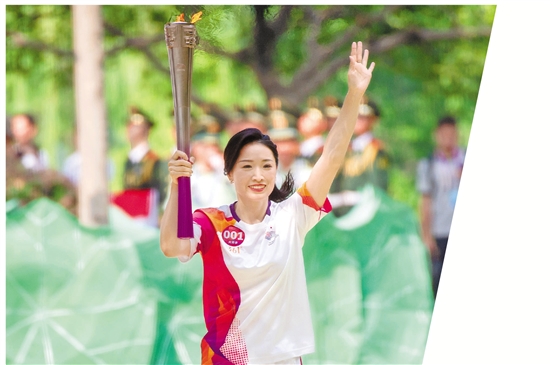 第一棒火炬手、奥运冠军罗雪娟在奔跑。 本报记者 徐彦 摄