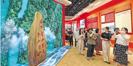 9月8日,大道之行——“八八战略”实施20周年大型主题展览在浙江展览馆开幕。图为观众参观会流动的“绿水青山”。