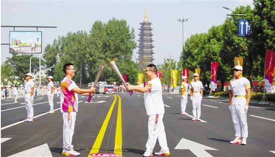 火炬手从古城老街跑向现代新城,背后是金华标志性景观万佛塔。 本报记者 朱海伟 吕之遥 摄