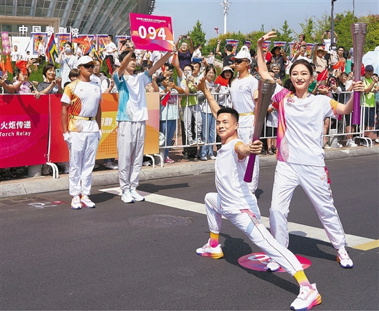 火炬交棒时,楼胜做了一个戏曲动作——“顺风旗”。
