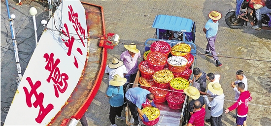 9月20日上午,舟山国际水产城码头一派繁忙景象,渔运船上卸下各类渔获,将被销往各地市场。