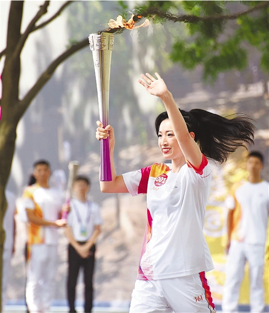 9月8日,杭州亚运会火炬传递在西子湖畔的涌金公园广场启动。图为第一棒火炬手罗雪娟在奔跑。 本报记者 潘海松 摄
