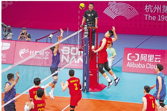 9月20日晚,中国男排迎来本届亚运会首秀,以3比0战胜吉尔吉斯斯坦队。 本报记者 王啸天 摄
