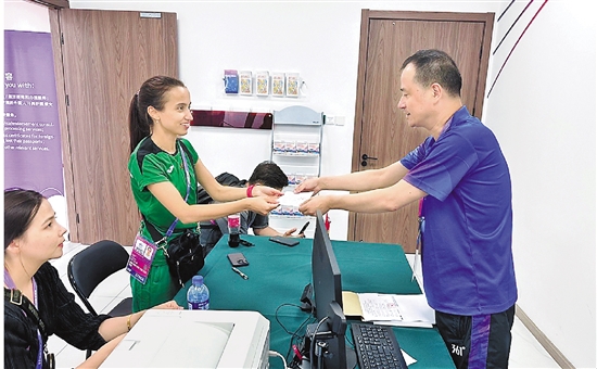 图为土库曼斯坦运动员接过办理好的临时证件。