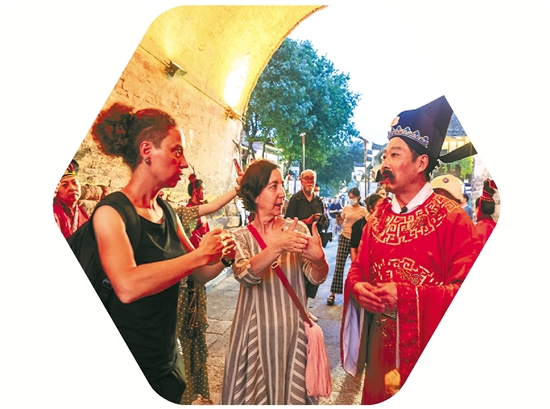 “诗画浙江”友好使者团一行在衢州市水亭门历史文化街区,观看大型沉浸式演出“东南阙里”。