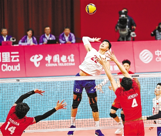 中国男排对阵印度尼西亚队。 本报记者 董旭明 摄