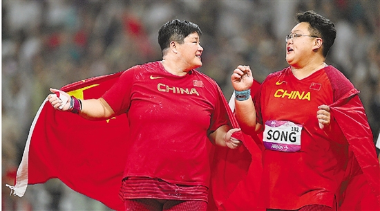 9月29日晚,中国选手巩立姣(左)获杭州亚运会女子铅球冠军。 本报记者 董旭明 王建龙 摄