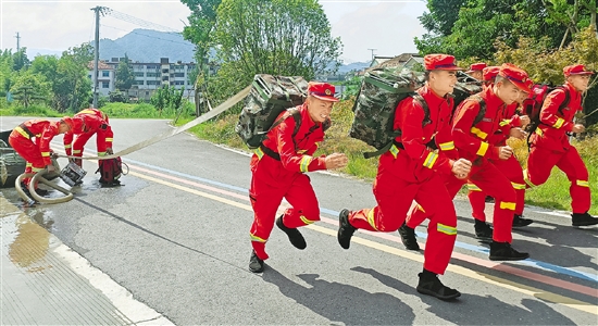 队员们训练从山下铺设水带到山上。 拍友 贾毅鑫 摄