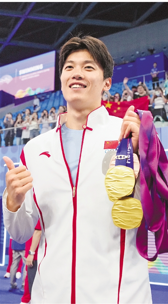9月29日,中国选手汪顺展示获得的奖牌。 新华社记者 杜宇 摄